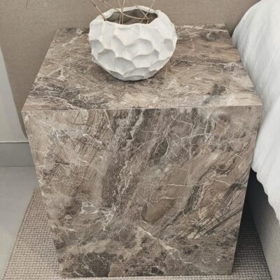 Odkryj nasz wyjątkowy stolik nocny wykonany z naturalnego marmuru. Jego sześcienna, solidna konstrukcja i bogate, unikatowe użyłowanie w odcieniach ziemi wprowadzają do wnętrza elegancję i luksus. To idealny akcent dla sypialni w stylu glamour, nowoczesnym lub klasycznym. Marmur gwarantuje trwałość i niepowtarzalny charakter. Podkreśl prestiż swojej przestrzeni – wybierz naturalne piękno kamienia.