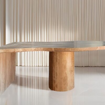 Wyjątkowy stół wykonany z trawertynu w ciepłej, beżowo-brązowej tonacji.