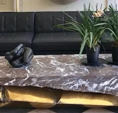 Prezentujemy stół kawowy, który łączy pierwotną siłę kamienia z wyrafinowanym luksusem metalu. Blat z grubego marmuru o nieregularnych, surowych krawędziach jest osadzony na rzeźbiarskiej, metalowej podstawie w kolorze postarzanego złota.