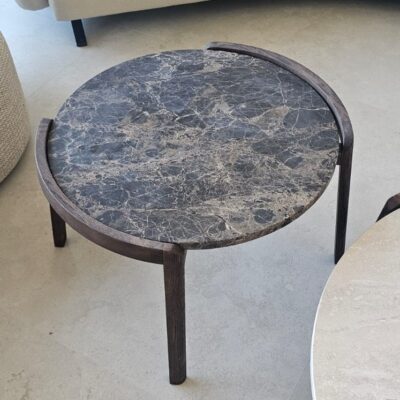 Elegancki, okrągły stolik boczny, charakteryzujący się luksusowym wykończeniem. Blat wykonany z ciemnego marmuru Dark Emperador o wyrazistym, metalicznym żyłkowaniu jest osadzony w minimalistycznej, ciemnej ramie. Opływowe, wygięte krawędzie stelaża estetycznie otulają kamień, tworząc niepowtarzalny i dynamiczny detal. Idealny do wnętrz w stylu nowoczesnym i glamour.
