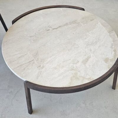 Okrągły stolik , który doskonale łączy nowoczesną estetykę z naturalnym ciepłem. Blat z jasnego, kremowo-beżowego marmuru o subtelnym, szarym żyłkowaniu, jest otoczony ciemną, wygiętą ramą.