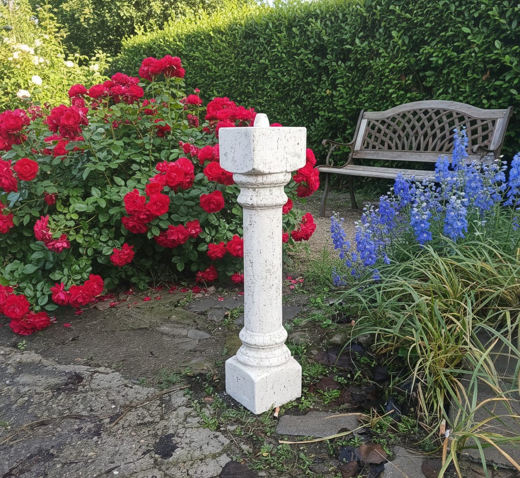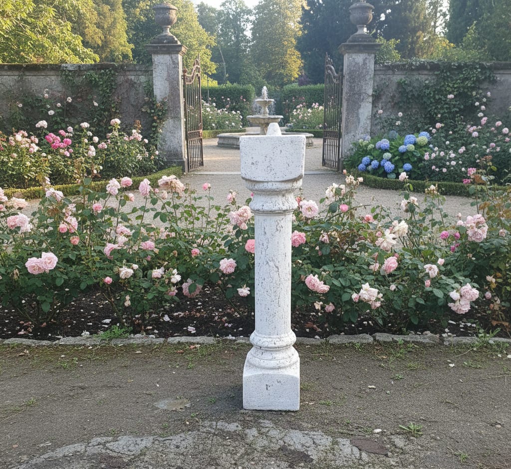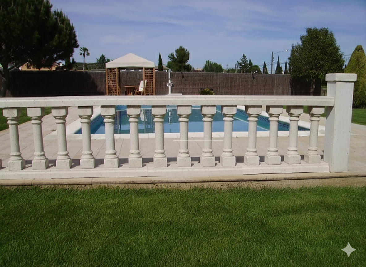 Stylowa balustrada wykonana z kamiennego tworzywa o klasycznym kształcie, imitująca trawertyn z otwartymi porami.