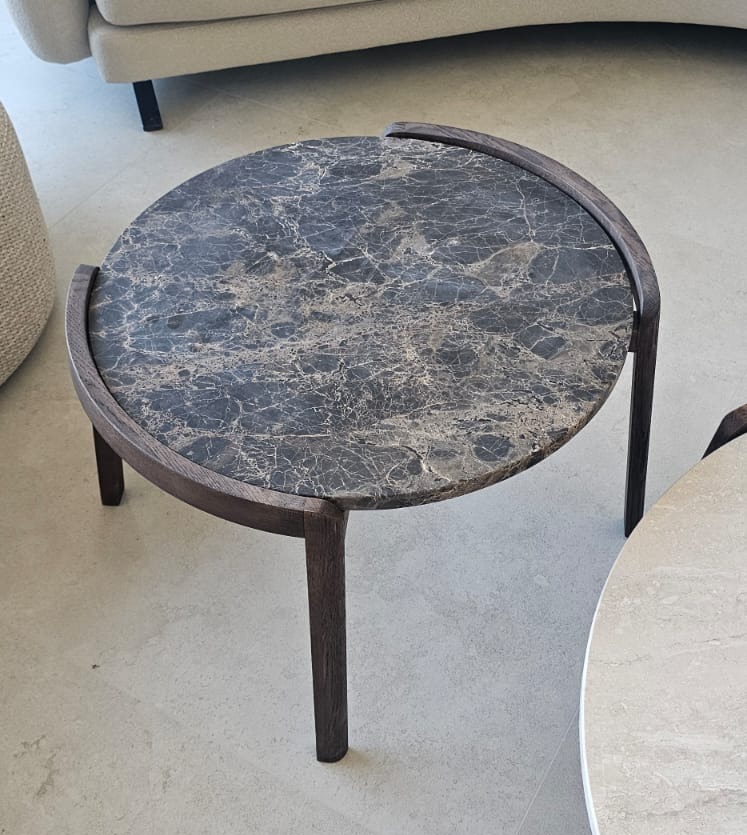 Elegancki, okrągły stolik boczny, charakteryzujący się luksusowym wykończeniem. Blat wykonany z ciemnego marmuru Dark Emperador o wyrazistym, metalicznym żyłkowaniu jest osadzony w minimalistycznej, ciemnej ramie. Opływowe, wygięte krawędzie stelaża estetycznie otulają kamień, tworząc niepowtarzalny i dynamiczny detal. Idealny do wnętrz w stylu nowoczesnym i glamour.